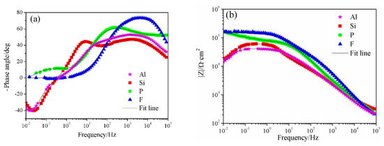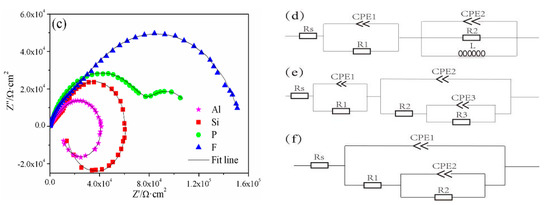 The frequency–response characteristics of the PEO coatings were studied by conducting EIS tests over the samples in 0.1 M NaCl aqueous solution. Figure 8a–c show the Nyquist and Bode plots of the PEO-coated samples, respectively. The impedance data were best-fitted to the appropriate equivalent circuit model, Figure 8d–f are corresponding equivalent circuits of different coatings, Figure 8d equivalent circuit Rs(CPE1R1)(CPE2R2L) is the equivalent circuit of Al-coating and Si-coating, Figure 8e The equivalent circuit Rs(CPE1R1)(CPE2(R2(CPE3R3))) is the P-coating equivalent circuit, and Figure 8f the equivalent circuit Rs(CPE1(R1(CPE2R2))) is the F-coating Combined equivalent circuit, the parameters of each component of the equivalent circuit are shown in Table 1.