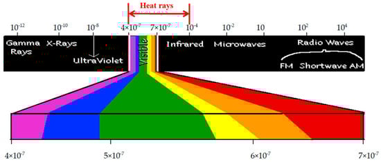 Many researchers have already conducted studies from different angles on the effect of solar radiation. According to the length of the wave, solar radiation can be divided into different wavelength bands such as ultraviolet light, visible light, and near infrared light. The wavelength of ultraviolet light is less than 400 nm, accounting for about 5% of total solar energy. The visible light wavelength range is 400–760 nm, which accounts for about 45% of the total solar energy. The infrared wavelength is greater than 760 nm, accounting for about 50% of the total solar energy. It can be seen that solar energy is mainly concentrated in the visible and infrared regions, as shown in Figure 2.