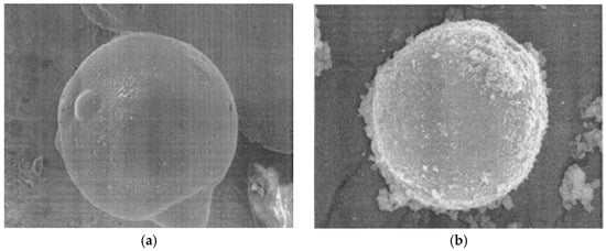 Figure 3. (a) SEM images of hollow glass microbeads; (b) SEM images of hollow glass microbeads wrapped with nano-TiO2.