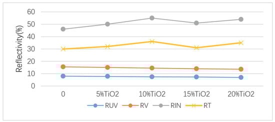 With the increase in TiO2 content, the total reflectance (Rtotal)/near infrared reflectance (Rnir) increased first and then decreased (stable), the visible light reflectance (Rvisi) decreased, and the ultraviolet light reflectance (Ruv) hardly changed. The test results are shown in Figure 4. In the chromaticity space, as the mass fraction of TiO2 increased, the brightness coefficient L* decreased, and the red and green channel index a* increased first and then decreased, indicating that the hiding power decreased first and then increased; that is, the darkest/hiding power reached its lowest at 10%. Therefore, we used 10% as the central point and set the level of near-infrared titanium dioxide (NIR-TiO2) in the orthogonal experiment to 3%, 5%, and 10%. The results showed that the amount of near-infrared titanium dioxide was less than 10% in engineering application, as shown in Figure 4.