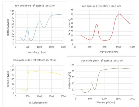 In particular, high reflectivity of buildings in the tropics will lead to high requirements for the visual safety of buildings, that is, excessive reflectivity will cause glare. We established a quantitative model between the optical reflection characteristics of the coating and the brightness index. The linear relationship between the visible light reflectance and the brightness index exhibited an exponential relationship. When the coating was a medium and low brightness (40 < L* < 80), as the brightness increased, the visible light reflectance of the coating increased linearly; when the coating was high brightness (L* > 80), as the brightness increase, the dark light reflectance of the coating increased exponentially [11]. Therefore, when optimizing the design of the coating, it is better to control the visible light reflectance of the coating to below 50% in order to control the brightness. Therefore, we chose iron oxide red color, which is more appropriate. From the perspective of the chromaticity space brightness index (L*), iron oxide red is a low-brightness, high-reflectivity filler, has excellent optical reflection characteristics, and can be a functional filler for dark high-reflection coatings.