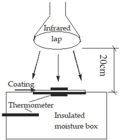 In a closed environment laboratory that maintains an indoor ambient temperature of 25 °C, the tested sample plate in the hollow at the top of the thermal insulation box was placed, and we used an infrared lamp to simulate the sun light source at a distance of 20 cm directly above for 30 min, as shown in Figure 8. That is, a stable thermal equilibrium state was reached. At this time, the temperature of the upper surface of the coating film, the temperature of the back surface of the steel plate and the ambient temperature of the box are measured, and the upper surface temperature is used as the main reference value for the reflection and heat insulation effect of the coating film.
