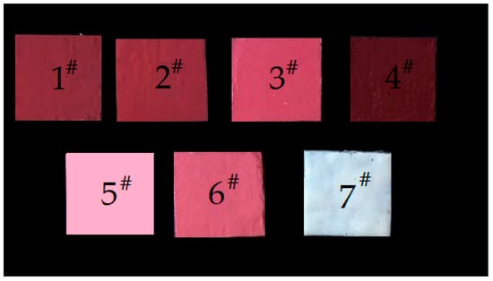 First, the additives and fillers were dispersed into water one by one under high-speed stirring, and stirred for 30 min to prepare a slurry. Then, the emulsion was slowly added to the slurry under the condition of medium-speed stirring. After the addition, stirring continued 30 r/min to obtain the coating. Brush the prepared coating on a stainless steel plate into a coating film with a diameter of 15 cm and a thickness of 650 μm, and the reflective heat insulation coating film was obtained after being completely dried for 24 h. According to Table 2, a total of seven coating films were obtained. Since the reflection brightness of the 7, 8, and 9 coating films was tested to exceed 50%, they were discarded. Samples 1–7 of the preparation coating film is shown in Figure 7.