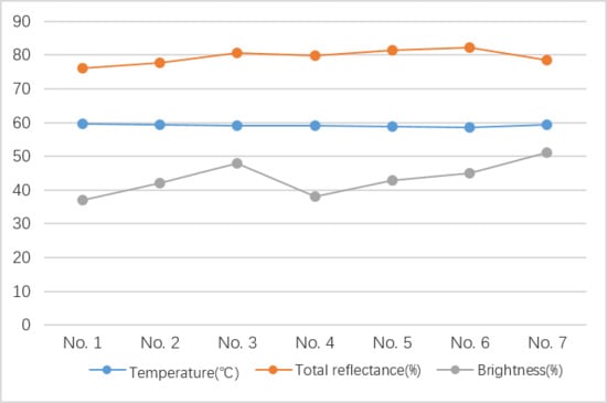 Based on the above test methods, we tested the coating temperature, reflectivity, and brightness, and seven parallel samples were used for each coating. The results are listed in Table 2. It can be seen from Table 2 that the primary and secondary order of the various factors that affect the comprehensive index is: C (iron oxide red) > A (TiO2) > B (hollow glass beads). Among them, the coating film of 6 had the lowest surface temperature, the highest reflectivity, and the brightness L* ≤ 50%. The coating formulas of 7, 8, and 9 were discarded because of L* > 50%. Therefore, the sixth group of filler formulas were used, namely: rutile titanium dioxide:hollow glass beads:iron oxide red = 8:12:2.