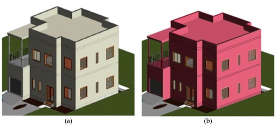 The methodology implemented in this paper was based on an analytical literature study and comparative analysis work for the two scenarios model of two stories of a residential building in Kuala Lumpur, Malaysia, as shown in Figure 9a,b. We conducted a simulation analysis on the application of the low-brightness and high-reflective coatings for this residential building. Table 3 shows the thermal characteristics of the materials used in the simulated residential building. Figure 9a,b shows the application of ordinary coatings and low brightness and high reflection coatings, respectively.