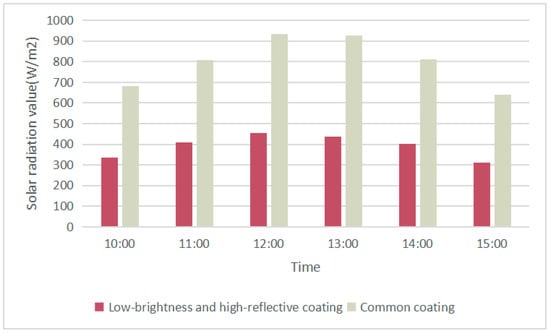 The simulation was conducted on April 11, 2019. The selected day was chosen due to Kuala Lumpur’s hottest season, which starts from March up to the first half of May. The simulation consists of three main stages, where only two of them were considered as the coatings’ effect. The simulation included three main parts, namely the east wall, the west wall, and the roof. The roof part receives the largest amount of solar radiation, so the coating effect is the most obvious. For the simulation of the solar irradiation roof, the time interval was from 10:00 to 15:00, and the coating effect is shown in Figure 10. In the same way, the reflectivity and thermal characteristics of the east and west walls can be obtained. Adding this kind of coating film, in the same way, the reflectivity and thermal characteristics of the east and west walls can be obtained.