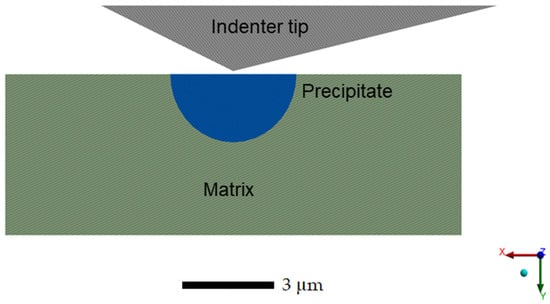 The contact between the nanoindenter tip and the surface was set to frictional with a friction coefficient equal to 0.1, and the contact between the particle and the matrix was set to bonded.
