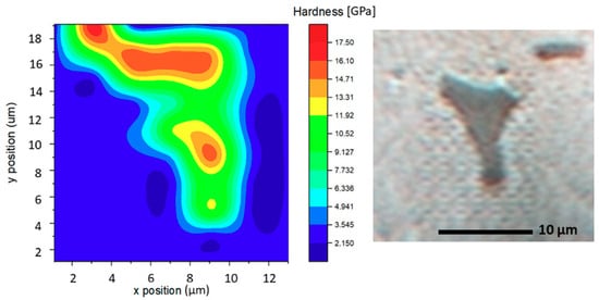 The next part of the experiment was creating a map of mechanical properties on the cross-section of a large intermetallic particle. The distribution of hardness is shown in Figure 4, and the distribution of Young’s modulus, in Figure 5.