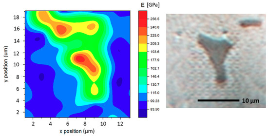 Figure 5. Map of elastic modulus distribution on the cross-section of a large intermetallic particle. The reference picture of an examined particle taken with an optical microscope is shown on the right.