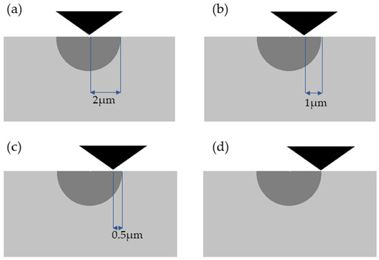 Based on the previously described numerical model, a series of simulations were carried out to determine the influence of the shape and depth of the particle on the accuracy of the nanoindentation result. For all of the variants, the authors decided to keep a constant depth of indentation, equal to 80 nm, and compare the curves of force vs. displacement. Four variants were adopted for the simulation, and they are shown in Figure 7. They consisted of (a) indentation at the very centre of the particle (2 µm from the boundary), (b) indentation at half of the radius of the particle (1 µm from the boundary), (c) indentation at quarter of the radius of the particle (0.5 µm from the boundary), and (d) indentation at the boundary between the particle and the matrix.