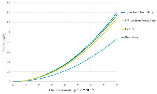 When analysing the obtained results in Figure 10, a difference was observed in force as a function of displacement for individual variants. Nevertheless, the presented characteristics did not clearly indicate that as the penetrator is brought closer to the boundary, the force decreases significantly in relation to the displacement.