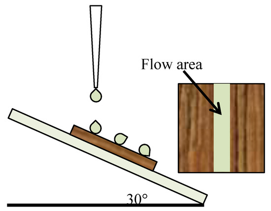 The samples were treated by ultrasonic vibration to study the influence of different vibration time on the stability of the PDA coating. The specific implementation method was that the superhydrophobic wood samples were put into the water and vibrated for 8 h in the ultrasonic vibration instrument (KQ2200, Kunshan Ultrasonic Instrument Co., Ltd., Kunshan, China) with power of 100 W and frequency of 42 KHz. Three wood samples were randomly taken out every 1 h as a group, and the CAs and SAs of their surfaces were measured and averaged in each group. In addition, considering that wooden products are usually used outdoors, a simulated rain experiment was set up, as shown in Figure 1. Three samples of the Wood@PDA–NaOH–OTS and the Wood@PDA–NaOH/SiO2–OTS were, respectively pasted on the surface of glass plate with an inclination angle of 30°. The sample surface was 20 mm away from the water outlet, the water flow speed was 2 L/h, and the outlet diameter was 2 mm. The CAs and SAs of the flow area after treatment of 3, 6, 9, 12 and 24 h were respectively measured and the average values were taken.