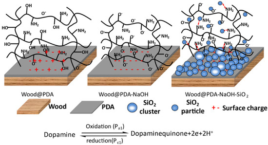 The PDA could form negatively charged DA quinone with deprotonation treatment, then a chemical bond formed between it and the function group of the wood surface by the REDOX reaction [36]. Figure 2 shows that the positive and negative charges on the surface of the Wood@PDA samples were uniformly distributed and showed electrical neutrality. However, PDA lost protons (H+) on the surface of the Wood@PDA–NaOH samples, showing negative electroactivity and electrostatic attraction, which made the PDA coating relatively stable. There were a large number of hydrogen bonds and electrostatic attraction on the surface of the Wood@PDA–NaOH/SiO2, thus its surface had better stability.