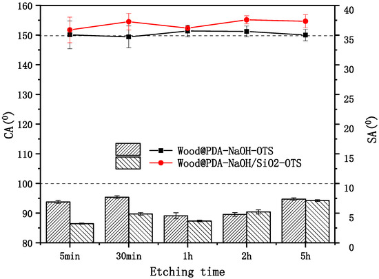 After low surface energy treatment, the results of surface wettability of the etched samples are shown in Figure 3. It could be seen that the CAs of wood samples had up to 150°and the SAs were all below 10°. The CA and SA of the Wood@PDA–NaOH–OTS were 151° and 4.8°, respectively. However, the Wood@PDA–NaOH/SiO2–OTS had a larger CA reaching a maximum of 155.1° and a SA of 5.0°. It should be noticed that there was little change of CA in different etching time. The reason was that the PDA was shed deeply with increasing etching time, but it was collapsed layer-by-layer. Therefore, the surface roughness of the etched samples displayed little change and the effect of etching time on roughness was not obvious.