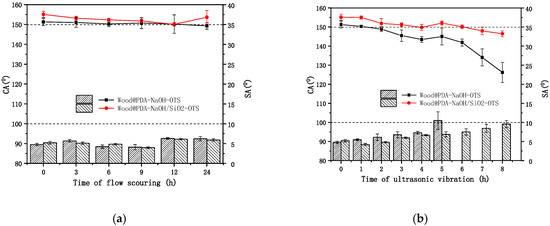 Figure 7. CAs (in lines) and SAs (in bars) of superhydrophobic wood under (a) flow scouring and (b) ultrasonic vibration.