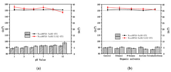 The chemical stability of superhydrophobic surface was investigated by soaking superhydrophobic wood samples in different pH solutions and organic solvents. As shown in Figure 8, the SAs of superhydrophobic wood were always below 10°. It can be seen from Figure 8a that the CAs of the Wood@PDA–NaOH–OTS and the Wood@PDA–NaOH/SiO2–OTS did not change obviously in a wide pH range. However, when the pH value was greater than 9, the superhydrophobic performance continued to decline, which may be caused by the slight shedding of nanoparticles. In Figure 8b, the CAs of samples maintained above 150°, indicating that Wood@PDA–NaOH–OTS and the Wood@PDA–NaOH/SiO2–OTS had excellent stability in organic solvents. The PDA coating could effectively improve the chemical stability of wood. After deprotonation, part of the PDA was shed, and the residual polymer was not sensitive to the change of pH. Moreover, the PDA coating was extremely easy to obtain, and the preparation condition was mild. It can form a layer of the PDA coating on almost any substrate surface with strong adhesion.