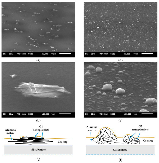 Figure 2 shows SEM images of Al2O3 + G1 and Al2O3 + G2 graphene coatings taken at an inclination of approximately 75 degrees. The analysis of the Al2O3 + G1 coating image (Figure 2a) indicates that the G1 graphene particles are in the form of thin nanoplatelets stacks located under the surface of the coating within the oxide matrix as well as protruding slightly above the surface (scheme in Figure 2c). In the image obtained at higher magnification (Figure 2b), the flat nature of the G1 nanoplatelet stack and its arrangement parallel to the surface of the coating and substrate is clearly visible.