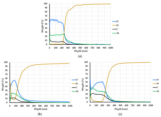On the basis of the profiles obtained, it is also possible to estimate the thickness of the coatings: approximately 200 nm for the Al2O3 coating, approximately 110 nm for the Al2O3 + G1 coating, and approximately 200 nm for the Al2O3 + G2 coating.