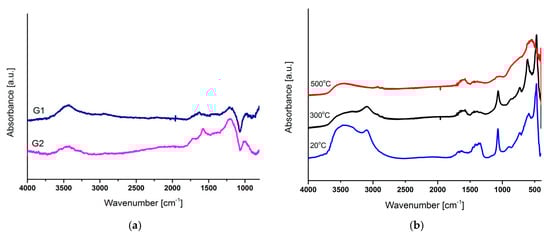 The similarity of the Al2O3 + G2 coating spectra (Figure 5b) to that of Al2O3 coating in the range of 400–1100 cm−1 indicated no effect of the addition of graphene G2 on the changes taking place in the Al2O3 matrix during its heat treatment. The conversion of AlOOH into Al2O3 was analogous to that in the alumina coating. In the spectra of the Al2O3 + G1 coatings treated at 20 °C and 300 °C (Figure 5a), bands in the range of 400–1100 cm−1 were less intensive and broadened. This may indicate a lower ordering of Al–O and Al–OH bonds structure caused by the presence of G1 graphene. However, in the spectrum of the coating treated at 500 ° C, further broadening of the bands and their shift towards higher wavenumbers, typical for the structure of the Al2O3 coating, were observed.