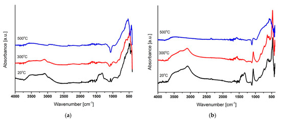 The range of 400–1100 cm−1 was characteristic for bands derived from Al–O bonds. The typical boehmite (AlOOH) band system (482, 620, 740, 1070, and 3090 cm−1) [16] was visible in the spectrum obtained at room temperature as well as heat treated at 300 °C. In the spectrum of coating heat treated at 500 °C, one can observe that the discussed band became wider and showed maxima at 560 cm−1 and 800 cm−1, which indicated the transformation of the matrix structure from AlOOH to Al2O3 [16].