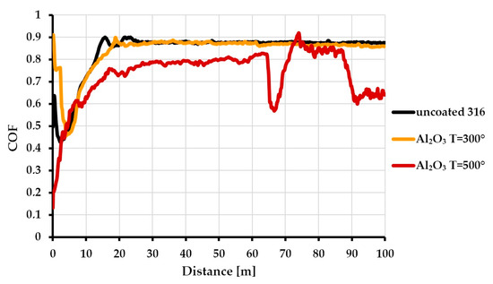 The results of the friction tests of uncoated 316 steel substrate and Al2O3 coatings heat treated at different temperatures are shown in Figure 6. In a test carried out on uncovered steel substrate, the COF quickly reached 0.88 and remained at this level (steady state) until the end of the test. A very similar shape of COF changes was obtained for the Al2O3 coating heat treated at 300 °C. The increase of COF over a short sliding distance to values typical for uncovered substrate is the result of rapid destruction of the coating. In the case of coating heat treated at 500 °C, the increase of COF was slightly slower and the destruction process was prolonged, which is probably the result of a better densification of the coating.