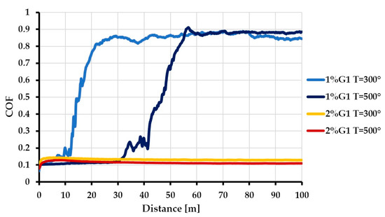Figure 7 shows the friction curves of Al2O3 + G1 coatings heated at 300 °C and 500 °C. Analyzing changes in the friction coefficient as a function of the friction path, significant differences can be observed. Compared with alumina coatings, no rapid initial increase/decrease of COF can be observed, regardless of the amount of graphene addition or heat treatment temperature. This may indicate a rapid development of a tribofilm containing graphene originated from the upper layer of the coating. The coating containing 1% of G1 graphene and heat treated at 300 °C lost its anti-friction properties over a sliding distance of over 12 m (~500 laps) and was destroyed, which is indicated by a rapid increase in COF to a value close to that of an uncovered steel substrate. Similar behavior was observed for the coating heat treated at 500 °C, except that the loss of anti-friction properties occurred over sliding distance of about 41 m (~1700 laps). In both cases, despite initially very low COF, the G1 graphene content appears to be too low to achieve and maintain a satisfactory self-lubricating effect. A slightly higher durability of the coating heat-treated at 500 °C compared with that of 300 °C may be a consequence of better densification of alumina matrix, which is typical for thermal processing of sol–gel derived coatings [52,58].