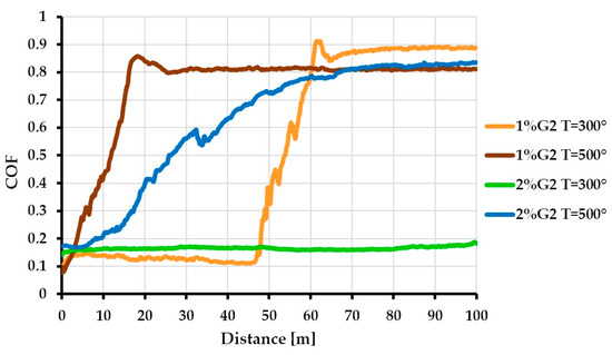 Figure 8 shows friction curves of Al2O3 + G2 coatings heat treated at 300 °C and 500 °C. In the case of a coating containing 1% of G2 graphene and heat treated at 300 °C, the sliding distance before wearing out was 47 m (~1900 laps), while the coating treated at 500 °C showed almost immediate growth of COF towards values above 0.8, characteristic for uncoated steel substrate. Similarly, the coating containing 2% of G2 graphene and heat treated at 300 °C had better durability than the coating treated at 500 °C. The coating with 2% of G2 graphene heat treated at 300 °C revealed low, stable COF of around 0.17 throughout the test, while the coating with 2% of G2 graphene heat treated at 500 °C showed a progressive increase of COF above 0.8 over a sliding distance of 70 m. The observed behavior is the opposite of that for coatings with the addition of graphene G1. Assuming a similar effect of higher heat treatment temperature on the densification of Al2O3 matrix, the difference in the behavior of the Al2O3 + G1 and Al2O3 + G2 coatings may be owing to the shape and spatial orientation of graphene nanoplatelets in the coating matrix. For Al2O3 + G1 graphene coatings, SEM images (Figure 2a,b) indicate parallel arrangement of the GNPs relative to the surface of the substrate and the coating. The shape and spatial arrangement of GNPs seem to be extremely conducive to the formation of graphene tribofilm. In work by Cheng et al. [59], it is proposed that “under high normal stress and localized heat during friction test, graphene sheets from nanoplatelets are pulled under shear and become welded with overlapping areas to form an ultrathin graphene tribofilm”. This type of confinement is indicated as crucial in the frictional behavior of graphene, provided the thickness of the GNPs is maintained [60]. Graphene sheets attached to sliding surfaces facilitate their movement because graphene shears easily owing to the weak van der Waals forces at the sliding contact interface [61,62,63]. This phenomenon can be particularly effective when the GNPs are parallel to the plane of sliding surfaces—in combination with the multilayer structure of GNPs, it would allow to effectively use the slip mechanism proposed in the literature [64,65,66].