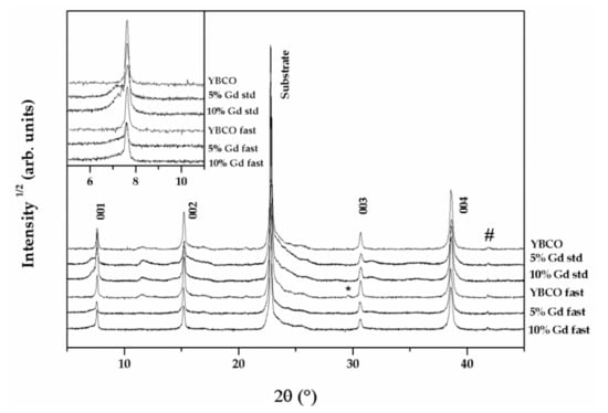 Good epitaxial YBCO films were obtained with the addition of both 5% and 10% Gd using both standard and fast-firing conditions. XRD patterns of films obtained with different doping levels are reported in Figure 1. The spectra were characterized by the presence of peaks ascribable to 00ℓ reflections of the YBCO phase and to the substrate, with few less intense features ascribable to the substrate contribution (e.g., broad halos at 2θ = 12° and 32° and Kβ reflections) and no clear pieces of evidence of the presence of crystalline secondary phases. Going further into details, from a detailed analysis of the 001 reflections (see inset in the figure), it can be observed that all samples with Gd doping were characterized by the presence of a broad peak at a lower angle with respect to the YBCO reflection. This feature might be ascribed to the presence of Y2Ba4Cu7O15 (Y247) phases or Y1Ba2Cu4O8 (Y124) (e.g., PCPDF card # 473–410), suggesting, therefore, a higher amount of stacking faults in these samples. However, this feature was observed only on the 001 reflection, suggesting that the stacking faults were widely dispersed, without the formation of large coherent scattering domains of these phases, and thus limiting the order of observable Bragg reflections.