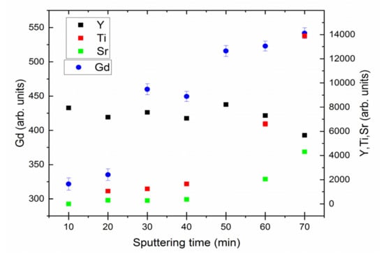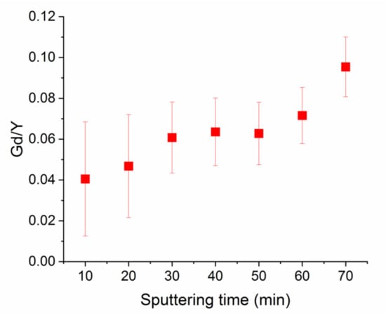 The XPS depth profile of a YBCO-Gd 5% sample grown on an STO substrate is shown in Figure 2. The depth profile consisted of seven sputtering cycles for a 70 min total sputtering time. The interface was reached at about 57 min, resulting in a sputtering rate value of about 1.3 nm·min−1. The Gd normalized intensity is shown on the left axis, while the Y, Sr, and Ti intensities are on the right axis. The depth profile showed the Gd intensity increasing with the etched depth, while the Y intensity remained fairly constant up to the interface region. Sr and Ti were also detected all over the thickness, with their intensities increasing in the proximity of the interface region. Diffusion from the STO substrate has been already observed in previous works, and it has been explained as due to the action of the propionic acid used as the solvent [,]. Figure 3 shows the Gd/Y distribution along with the −5% sample thickness. The Gd/Y behavior was quite homogeneous in the bulk film, i.e., far from the surface (30 min sputtering time) and up to the interface (57 min sputtering time). The Gd/Y stoichiometric ratio resulted in about 0.06 inside the film and about 0.06 in the total thickness, in good agreement with the nominal Gd 5 mol % content. The stoichiometric behavior of the YBCO-Gd 10% sample resulted similarly to the 5% doped film. In this case, the Gd/Y intensity ratio resulted in about 0.11 in the bulk film and about 0.13 in the total thickness. Figure 4 shows the binding energies of the Gd 3d5/2 (Figure 4a) and O1s (Figure 4b), measured on both the 5% and 10% YBCO-Gd samples as a function of the film depth. The binding energy values far from the surface (where they were not influenced by contamination) and before the interface (at about 57 min) were fairly constant. The red dot-dashed lines in Figure 4 indicate the binding energy of the Gd2O3 sample used as a reference. The corresponding binding energy value measured for the Gd 3d5/2 and O1s were 1187.0 eV and 530.1 eV, respectively, in agreement with the literature data on Gd2O3 oxide [,].