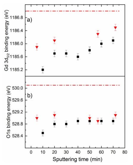 Binding energies as a function of the sputtering time for the YBCO-Gd 5% (black squares) and 10% (red triangles) films deposited by standard process. (a) Gd 3d5/2 binding energies; (b) O1s binding energies. The red dot-dashed lines indicate the binding energy position of the Gd 3d5/2 and O1s core-levels measured in Gd2O3.
