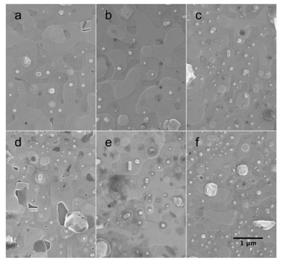SEM images at the same magnification of (a) YBCO, (b) YBCO-Gd 5%, and (c) YBCO-Gd 10% films deposited by the standard process; (d) YBCO, (e) YBCO-Gd 5%, and (f) YBCO-Gd 10% films deposited by the fast process. Scale bar: 1 μm.