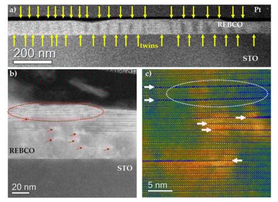 Figure 6b,c show the presence of Y124 intergrowths (in other words, ‘stacking faults’) in the YBCO matrix. The edges of these intergrowths produced strain in the YBCO matrix []. This strain was visualized by diffraction contrast in ADF STEM images as brighter (Figure 6b) or warmer (Figure 6c) contrast areas. The longer Y124 intergrowths contained Cu/O-deficient areas (see the highlighted area in Figure 6c), which appeared to be 1D ferromagnetic clusters []. The visualized features observed in the sample (twins, strains, and clusters in Y124) created a rich pinning landscape.
