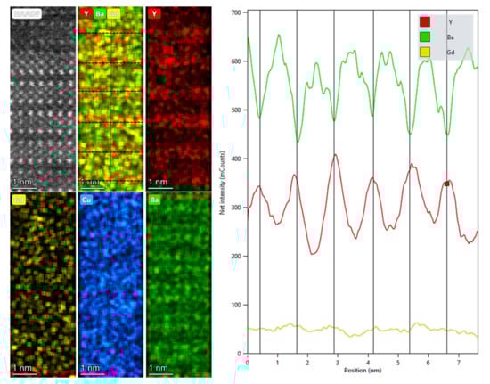 EDX analysis, Figure S1 and Figure 7, confirmed a uniform distribution of Gd in the film being in a good agreement with XPS studies on a larger area (5 mm × 5 mm). Therefore, TEM and XPS results demonstrated that a compositional homogeneity of the YBCO-Gd films was clearly evidenced at different scales. In addition, this analysis showed that the film was perfectly epitaxial to the STO substrate. The integrated profile over the Gd map confirmed that Gd occupied some of the Y positions in YBCO perovskite structure, in agreement with XPS indications.