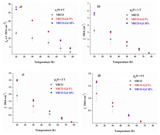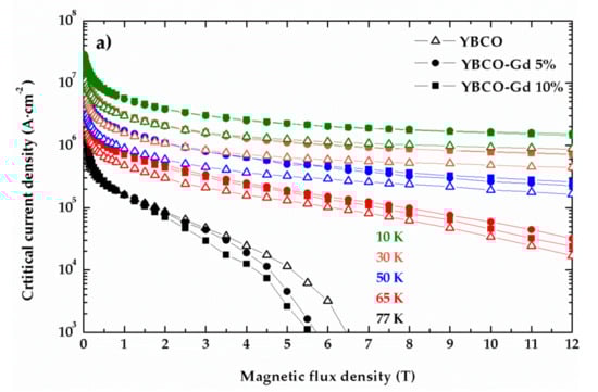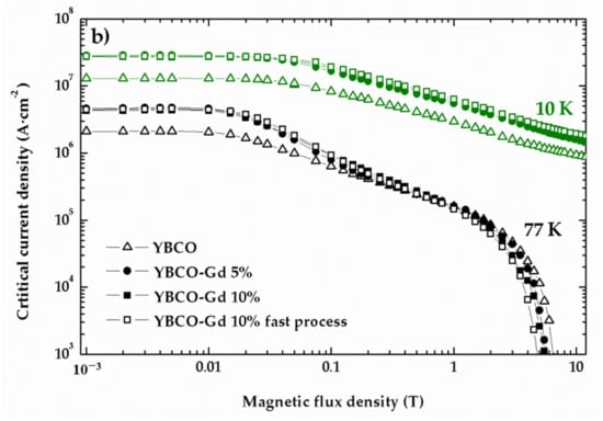 At lower temperatures, similar features could be recognized in the low-field behavior. At 10 K, the introduction of Gd led to an increase in Jc(0) to about 30 MA·cm−2 for both 5 and 10 mol % films (Figure 9a), but, as observed at 77 K, not for μ0H* (Figure 8b and Table 4). The obtained values in the range 30–50 mT agreed with the reported results for MOD YBCO films at low temperatures. It was observed that the low-temperature value of μ0H* was directly related to the microstrain generated by the incorporation of nanoparticles in nanocomposite YBCO films. On this basis, the reported μ0H* values in YBCO-Gd films were consistent with the relatively low effect of Gd addition on the film microstrain (see Table 2) [].