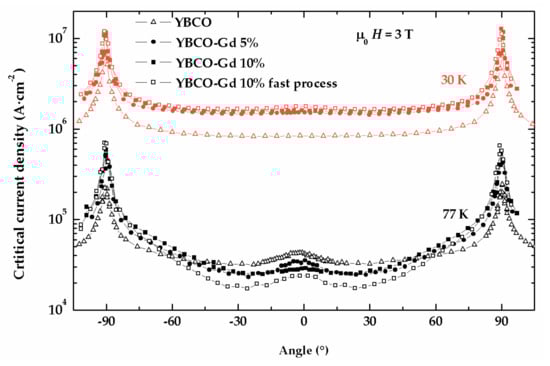 Angular measurements supported the aforementioned scenario and provided some additional hint on the role of Gd addition on Jc behavior in YBCO films. In Figure 10, the Jc(θ) angular curves measured at 77 and 30 K and μ0H = 3 T for YBCO-Gd and pristine YBCO samples were plotted. At 77 K, the pristine Jc curve exhibited a different dependence with the magnetic field angle. In fact, Jc values were higher than the Jc measured for Gd samples in a wide angular range between about −45°< θ < 45° (in agreement with the already discussed Jc(H) plotted in Figure 8a), whereas the opposite could be observed in other magnetic field orientations and, in particular, for θ = ±90°. These improvements in YBCO-Gd films suggested that ab-plane intrinsic pinning was particularly strengthened in such samples. This could be ascribed to the increased density of stacking faults recognized by TEM investigations with respect to the pristine YBCO film. In fact, it is well known that effective ab-aligned planar defects often extend their effect on a wider angular range because, due to energetic reasons, it is more convenient for magnetic vortices, within a certain angle spread centered at θ = ±90°, to be accommodated along the defect length []. More interestingly, it has to be pointed out that in that region, the 10 mol % Gd film had the highest Jc values. Jc(θ) curves recorded at both 77 and 30 K for YBCO-Gd 10 mol % with faster temperature ramp appeared very similar to the standard ramp sample, indicating that the increase from 10 to 30 °C·min−1 was not enough to promote significant changes in YBCO-Gd films, in agreement with previous analyses.