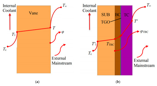 Thermal parameters definition. (a) uncoated vane; (b) coated vane.