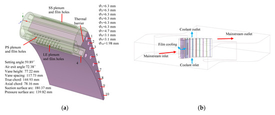 Because of the continuing demand for the increment of thermal efficiency and the decline of fuel consumption, the inlet temperature of gas turbines has far exceeded the normal material temperature limits of the vane over the previous century [1,2]. Thus, multiple cooling and thermal protection techniques have applied to ensure gas turbine working within safety margins, which include internal cooling and film cooling, as well as thermal barrier coatings (TBCs) [3,4].