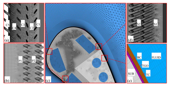 Computational grids. (a) leading edge film cooling holes, (b) pressure side film cooling holes, (c) computational grids, (d) suction side film cooling holes, (e) multilayered thermal barrier coatings (TBCs).