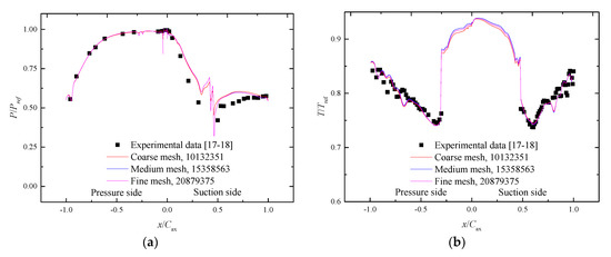Figure 4 shows the comparisons between numerical results and experimental data, at the midspan (z = 0 mm). The references total pressure and static temperature are 285.13 kPa and 701 K, respectively [17,18]. Change rules of the total pressure and static temperature show the same trend for different mesh models, and the medium mesh model is the proper choice with enough computational accuracy and efficiency. For dimensionless total pressure distribution, calculated values are in good agreement with the experimental data from Hylton et al. [17,18], although the calculated values are slightly larger in the area between 0.25 < x/Cax < 0.50, with maximum deviations at about 5%. For static temperature distribution, the calculated value of static temperature is also in good agreement with the experimental data, with maximum deviations less than 5%. In summary, the k-kl-ω turbulence model and simulation strategy applied in this work can accurately predict the change trend of pressure and temperature distributions on the vane surface.