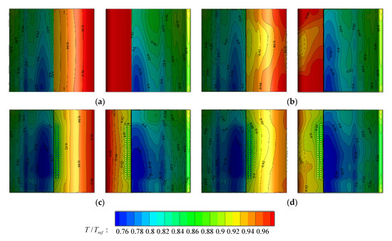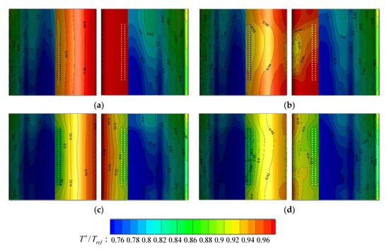 Substrate temperature comparisons for different cases. (Tref = 701 K). (a) uncoated vane without film, (b) uncoated vane with LE film, (c) uncoated vane with downstream film, (d) uncoated vane with LE and downstream film.