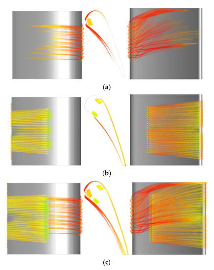 Streamlines distribution comparisons for different cases. (a) uncoated vane with LE film, (b) uncoated vane with downstream film, (c) uncoated vane with LE and downstream film.