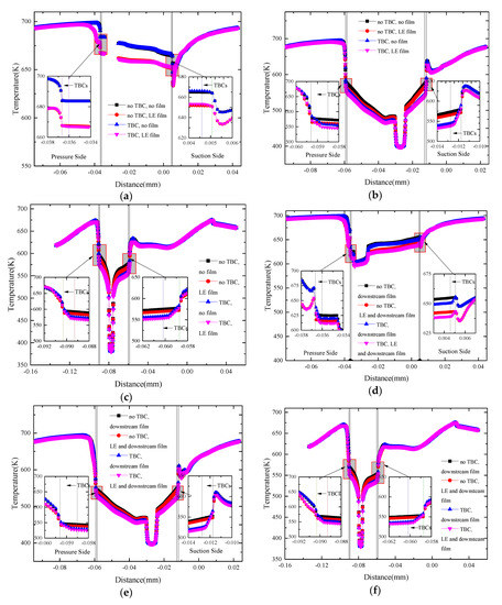 Figure 7 shows the comparisons of the dimensionless temperature distributions along the external wall of the uncoated vane at cutting planes of z = −19.3 mm, z = 0 mm and z = 19.3 mm, for different cases. For an uncoated vane without film, a local maximum of temperature appears on the regions close to the stagnation line, which is about 686 K, at all cutting planes. Temperature on the PS is higher than the SS of the forward portion. On the PS of aft portion, a local minimum appears in the area around x/Cax = −0.36, which is near the radial channel of No. 4. Further along the TE, the second minimum appears around x/Cax = −0.67, which is near the radial channel of No. 7. On the SS, the temperature distribution is similar to that of the PS, where a local minimum appears in the area around x/Cax = 0.6, while the second appears around x/Cax = 0.8. For uncoated vane with LE film, the decreasing amplitude of temperature on the SS is much smaller than that on the PS of the aft portion, especially at a cutting plane of z = 19.3 mm. In comparison with the no film case, temperature decline is about 15.6 K at x/Cax = −0.36; close to the radial channel of No. 4 on the PS. On the SS, the value is decreased to 6.0 K at x/Cax = 0.6, near the same radial channel. This result shows that, coolant ejections keep their 3D turbulent flow characteristics and thus provide more effective coverage of film cooling on the PS.