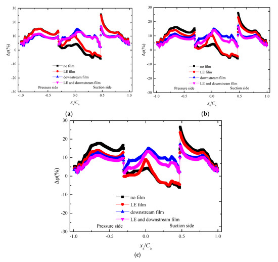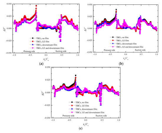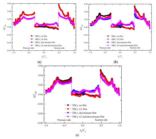 Figure 12 shows the comparisons of temperature decline in the substrate material at cutting planes of z = −19.3 mm, z = 0 mm and z = 19.3 mm, for different cases. Positive value means that the temperature of the substrate surface is lower than that of the coatings surface. For coated vane without film, TBCs on the PS is more effective than on the SS and regions, with negative values appearing in the area between 0.13 < x/Cax < 0.48, for all cutting planes. In this area, a local minimum appears at x/Cax ≈ 0.33, which is equal to −3.2 K at the midspan. This result suggests that, even without film cooling, the temperature of external hot gas can still be lower than that of the substrate metal. The lower temperature is caused by strong acceleration of mainstream from the stagnation line of the SS. In this area, TBCs hamper the heat flux transfer from substrate metal into the external mainstream. Thus, without film cooling, effectively internal cooling inside the vane is the premise of overall cooling effectiveness increment for coated vane. For coated vane with LE film, the temperature decline close to LE coolant plenum is always larger than other regions on forward portion of the vane, especially at the midspan where the LE film cooling holes mounted. As mentioned before, there are no film holes mounted on the LE of the cutting plane of z = −19.3 mm and z = −19.3 mm. At cutting plane of z = −19.3 mm, TBCs are more effective than that of the no film case on the forward portion of the vane, which is because of the internal cooling improvement on this plane. At a cutting plane of z = 19.3 mm, negative values appear on the PS of forward portion, as well as the regions at the same position of the no film case on the SS. In this area, a local minimum appears around x/Cax = 0.33, which is about −4 K at this plane. This result suggests that internal cooling improvement caused by coolant introduction increase the temperature gradient of TBCs on the regions close to coolant plenums and film cooling holes. However, the influence of TBCs addition goes down, and even shows negative roles on the regions away from coolant plenums and under the effective coverage of film cooling. For coated vane with LE and downstream film, smaller values appear on the regions close to the upstream of the PS and SS plenum at the cutting plane of midspan and z = 19.3 mm, in comparison with the downstream film case. On the aft portion of the vane, the improved film cooling coverage leads to a smaller temperature gradient inside the TBCs. As mentioned before, the forward and aft portion of the vane is split by a thermal barrier. Introduction of film cooling on the forward portion has no influence on the internal cooling of aft portion. Thus, the improved film cooling coverage declines the thermal insulation effect of TBCs on the aft portion of the vane.