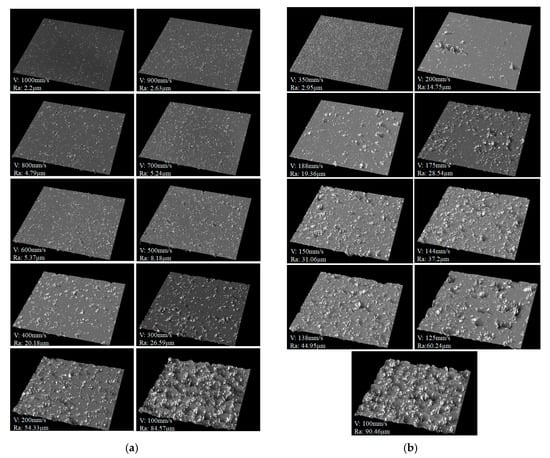Another important aspect of the coating system is the surface profile after the coating process. In cases where the average surface roughness exceeded 60 µm the surface profile of the coating mirrored the roughness profile of the substrate. A rough coated surface finish is not desirable and requires additional processes to obtain a suitable finish for the cylinder bore liner application. These processes include additional spray time and material, and additional honing to create the smooth finish required for the piston to slide efficiently and effectively on the cylinder bore wall. Therefore, for this study, the optimum average surface roughening value is considered to be 20–60 µm. It should also be noted that decreasing the roughness value results in increased nozzle velocity and decreased processing time, so a roughness value close to 20 µm is the most favorable.
