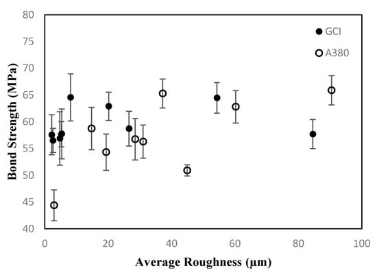 The adhesion strength between the coatings and substrates was determined to be the force required to separate the coating from the substrate. Failure during pull-off adhesion testing can occur in many ways including at the glue which binds the dolly to the coating, adhesively at the interlock between the coating and substrate, cohesively between the splat layers of the coating, or mixed mode which is a combination of glue, adhesive, or cohesive based failure [20]. The adhesion testing of these samples revealed how average surface roughness affected the bond strength between the spray coating and substrate and is plotted in Figure 6 for GCI and A380. Generally speaking, the GCI plasma spray system exhibited higher bond strength than the A380 sample. With a big variation in average surface roughness (2.2 to 85 µm) the bond strength varies within the range from 53 MPa to 66 MPa for GCI. For the A380 plasma spray coated system, there was a larger variation in average surface roughness (~3 to 90 µm) and the bond strength values ranged from 44 MPa to 66 MPa. For A380, the pull-off strength at 2.95 µm roughness is the lowest (~44 MPa) because of the lack of favorable mechanical anchoring sites. There is also a decrease in pull-off strength at a surface roughness value of 44.95 µm for A380 but the pull-off adhesion strength of 51 MPa is still in the recommended range. Therefore, all the measured bond strength values are above the required 30 MPa for cylinder liners and most range between or above the recommended 45 to 55 MPa outlined by Barbezat et al. [14]. Also, it is important to note that for three pull-off adhesion tests conducted for each sample there was little variation in measured pull-off adhesion strength.