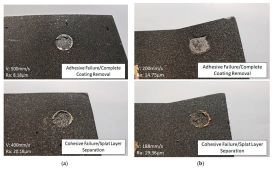 The substrate-coating combinations studied in this work experienced failure characteristics depending on the surface roughness profile. The failure modes for all the pull-off tests are presented in Table 3. It was noted that for both substrates, when the average surface roughness value was below ~20 µm, the adhesion strength test resulted in an adhesive failure of the coating layer. However, above 20 µm the failure was no longer a clean coating removal and failure occurred cohesively between the coating splat layers. Images of the complete coating removal and splat layer failure types for the GCI and A380 samples are presented in Figure 7. Therefore, an average surface roughness of 20 µm or greater should be considered optimal for adhesion strength between the pulsed waterjet roughened surface and spray coating. This is because if failure does occur, the remaining coating would protect the substrate from the environment.