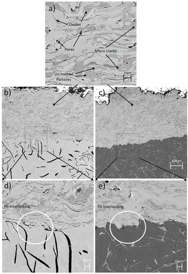 Cross-sectional SEM images showing the splat layers of the PTWA coating (a), profile of pit interlocking between the (b) Metcoloy #2 and GCI and (c) Metcoloy #2 and A380, and magnified images of pit interlocking between the (d) Metcoloy #2 and GCI and (e) Metcoloy #2 and A380.