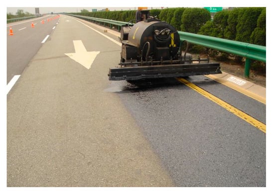 Asphalt pavements deteriorate over time due to various factors, such as, material aging, traffic loading or environmental factors [1,2]. Some of the most usual defects are rutting, cracking, roughness and slippery pavements [3,4], rutting and cracking are the most common early diseases of asphalt pavements [5,6,7]. The preventive maintenance of asphalt pavements alleviates pavement diseases. A fog seal is widely used as an effective measure for the preventive maintenance of pavements [8,9], the application of fog seal on pavement is shown in Figure 1. Most studies on fog seals focused on development and road performance. Modified emulsified asphalt and water-based epoxy resin emulsion are often studied as the constituent materials of a fog seal [10,11,12,13]. Research on the road performance of a fog seal mainly focuses on the four aspects of skid resistance, permeability, wear resistance, and aging resistance. Fog seal will fill a part of the gap after it is used on the pavements surface, thus reducing the skid resistance of the pavements surface [14]. The skid resistance in pavements is a vital factor for any road administration because with higher friction available, drivers can better control their vehicles [15,16], the decrease of skid resistance will lead to the decrease of road safety. A fog seal negatively affects the skid resistance of an asphalt pavement, but the skid resistance is greatly improved after adding skid resistance particles [12,17,18]. The fog seal permeability is the basis for ensuring that the fog seal layer fully penetrates and fills the gaps in a pavement [19,20,21]. Previous studies showed that the fog seal permeability is related to the material composition [11,12,22]. That is, as the number of wear times increases, the mass loss rate of a fog seal gradually increases, and the skid resistance decreases [12,18,23]. A fog seal can easily age under the action of ultraviolet rays because its materials are all organic matter. Therefore, many studies have focused on the aging resistance of fog seals [11,12,24]. In addition, studies on the bond performance of fog seals have also been performed [11,25].