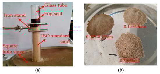 The penetration test [31] equipment included permeable glass tubes with upper and lower openings, an iron stand, a lower sealing screen, a funnel, and International Organization for Standardization standard sand. The permeable glass tube was filled with standard sand of a certain quality as the permeability channel of the fog seal. The iron stand was used to fix the permeable glass tube and funnel. Meanwhile, the lower seal screen was placed under the permeable glass tube. Figure 5 displays the permeate test device.