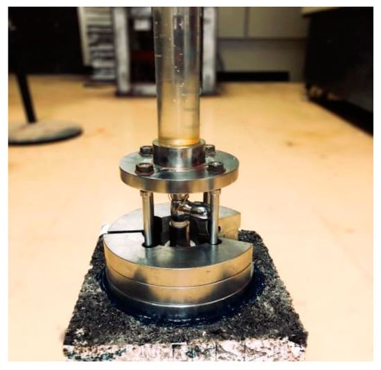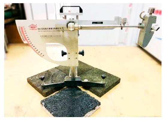 The water seepage test [33] was used to measure the water seepage performance coefficient of the AC-13 asphalt mixture rut boards after adjustment and gradation and the rut boards coated with the fog seal. The reduction ratios of the water seepage coefficients of the rut boards after the fog seal binder application were compared to evaluate the water seepage performance of the mist sealant. Figure 9 shows the device used in the water seepage test.